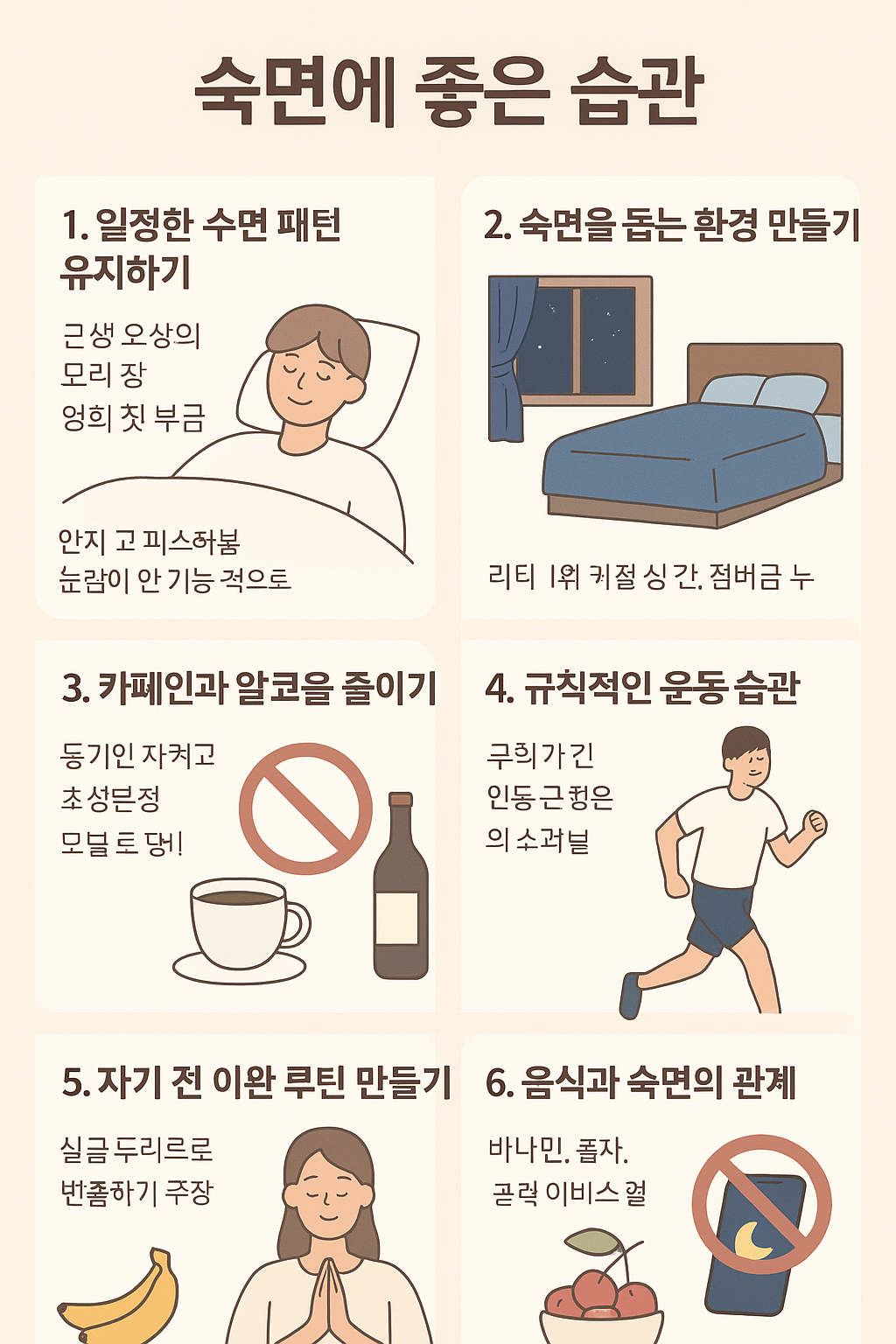 현대인의 가장 큰 고민 중 하나가 바로 ‘숙면 부족’입니다. 바쁜 일상, 스트레스, 스마트폰 사용 등으로 인해 깊은 잠을 자지 못하고 피로가 누적되는 경우가 많습니다. 하지만 몇 가지 생활 습관을 조정하는 것만으로도 숙면의 질을 크게 향상시킬 수 있습니다. 이번 글에서는 숙면에 도움이 되는 과학적이고 실천 가능한 습관들을 정리해 보겠습니다.