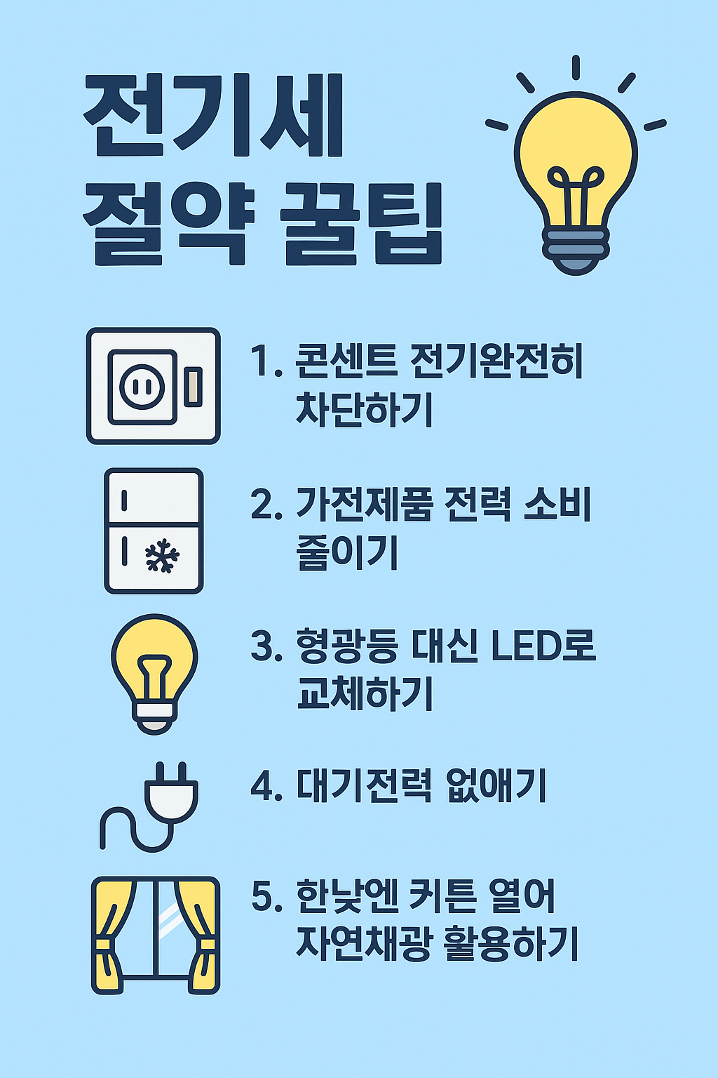 전기세 절약은 단순히 돈을 아끼는 차원을 넘어 에너지 절약과 환경 보호에도 직결됩니다. 오늘 소개한 방법들을 생활 속에서 차근차근 실천하면 가계 부담은 줄이고, 지구 환경에도 기여할 수 있습니다. 작은 습관의 변화가 모여 큰 차이를 만든다는 점을 꼭 기억하세요.