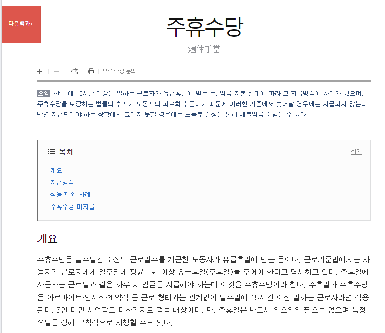 일주일 단위로 계산하여 1일 휴일은 유급으로 취급하여 급여를 지원하고 있으며 기업과 근로자 수 , 근로형태 상관없이 조건에 만족하면 받을 수 있습니다.