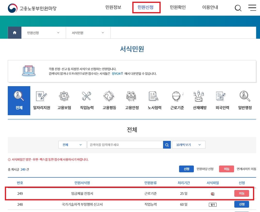 네이버를 통해 고용노동부 홈페이지에 접속한 뒤 상단에 있는 '민원 신고' 메뉴를 선택한 다음 가장 첫 번째에 있는 '임금체불 진정서'를 작성하면 됩니다.